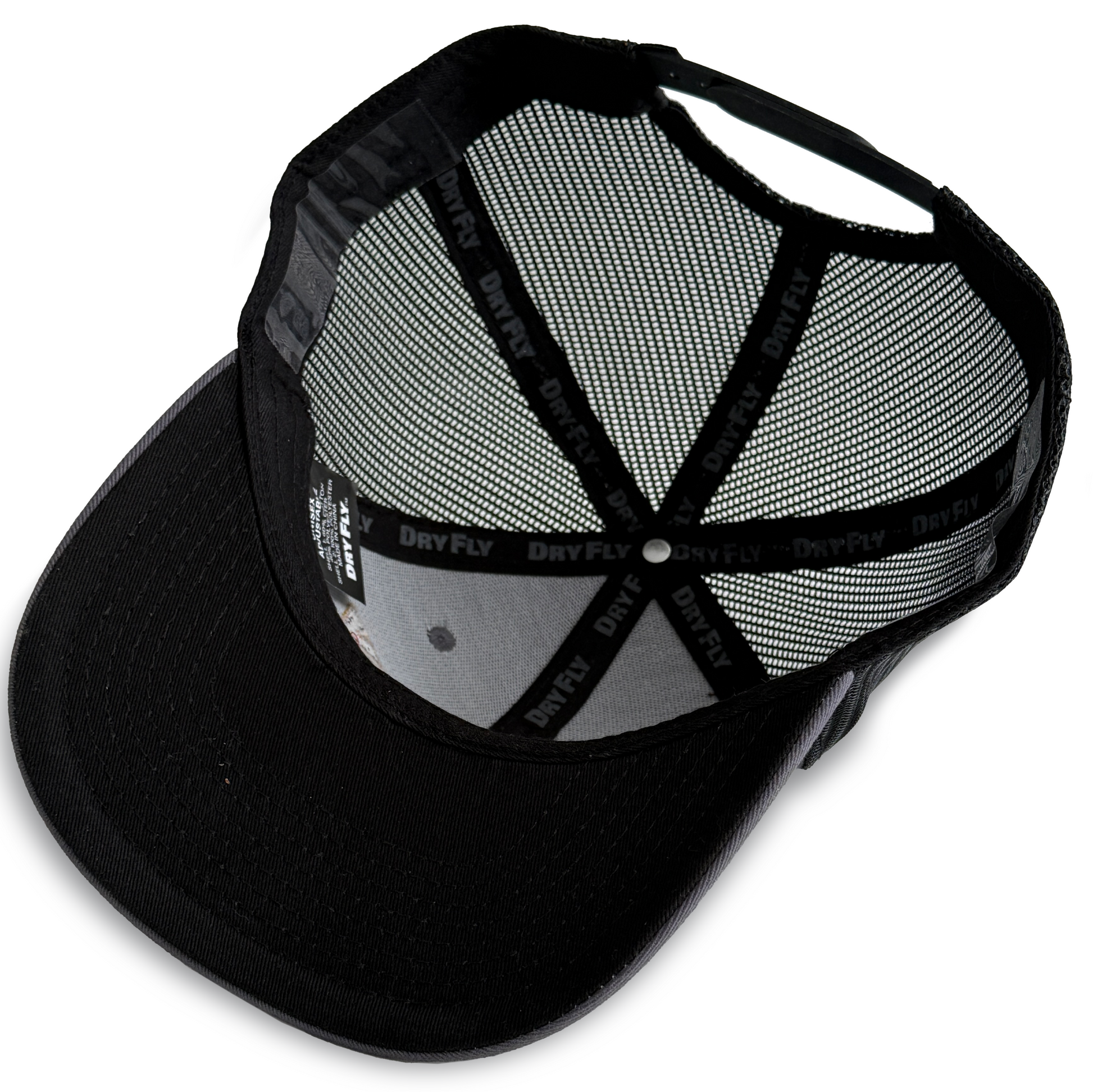 The Dry Fly Magnet Hat is everything you will want in a fly fishing hat… plus it has a built in magnet that will hold a few of your favorite flies while you are on the water. It has a classic trucker hat shape and design with a breathable mesh back and adjustable snap closure. A slightly curved brim and a medium height crown. The hat’s structure is definitely a step up from the old “Dad hat” but not too steep. The bottom of the brim is black to reduce glare reflecting up off the water. The sweat band is also black to avoid discoloration and ever looking dirty. The branding on the crown is big and bold - clearing answering the question of your fly preference. Dry Fly branding on the inside tape and on a small tag on the back left.