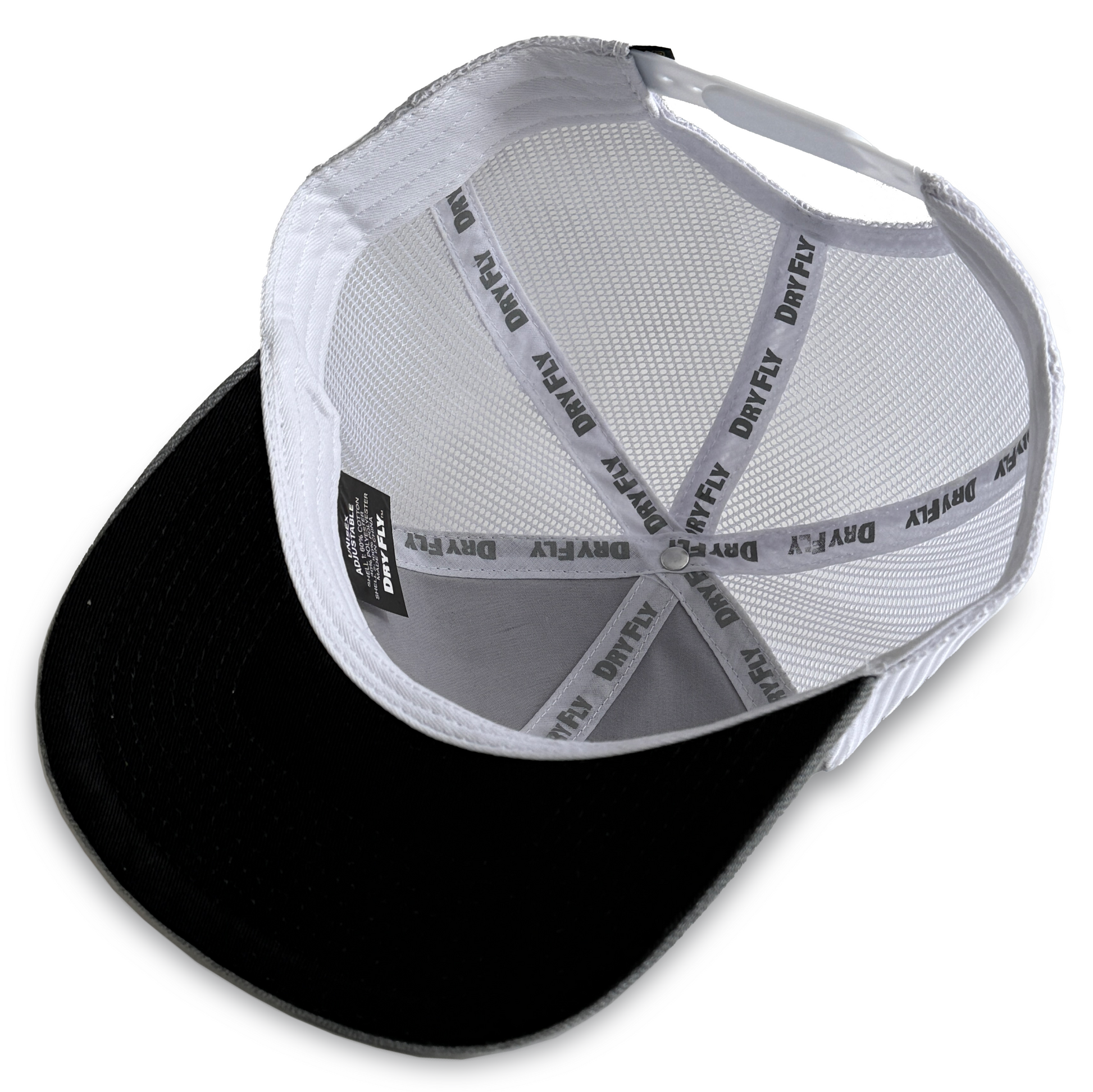 The Dry Fly Magnet Hat is everything you will want in a fly fishing hat… plus it has a built in magnet that will hold a few of your favorite flies while you are on the water. It has a classic trucker hat shape and design with a breathable mesh back and adjustable snap closure. A slightly curved brim and a medium height crown. The hat’s structure is definitely a step up from the old “Dad hat” but not too steep. The bottom of the brim is black to reduce glare reflecting up off the water. The sweat band is also black to avoid discoloration and ever looking dirty. The branding on the crown is big and bold - clearing answering the question of your fly preference. Dry Fly branding on the inside tape and on a small tag on the back left.