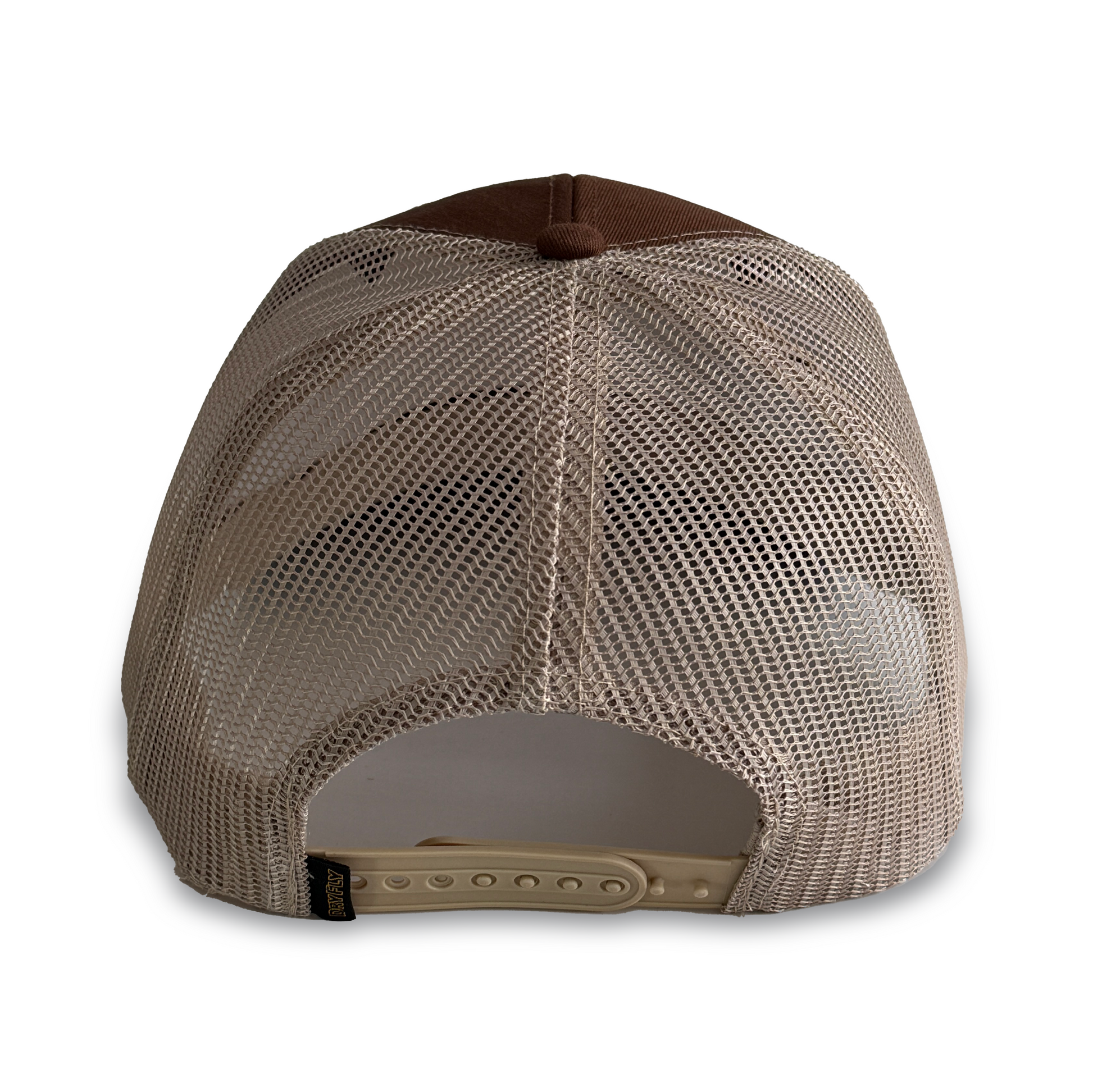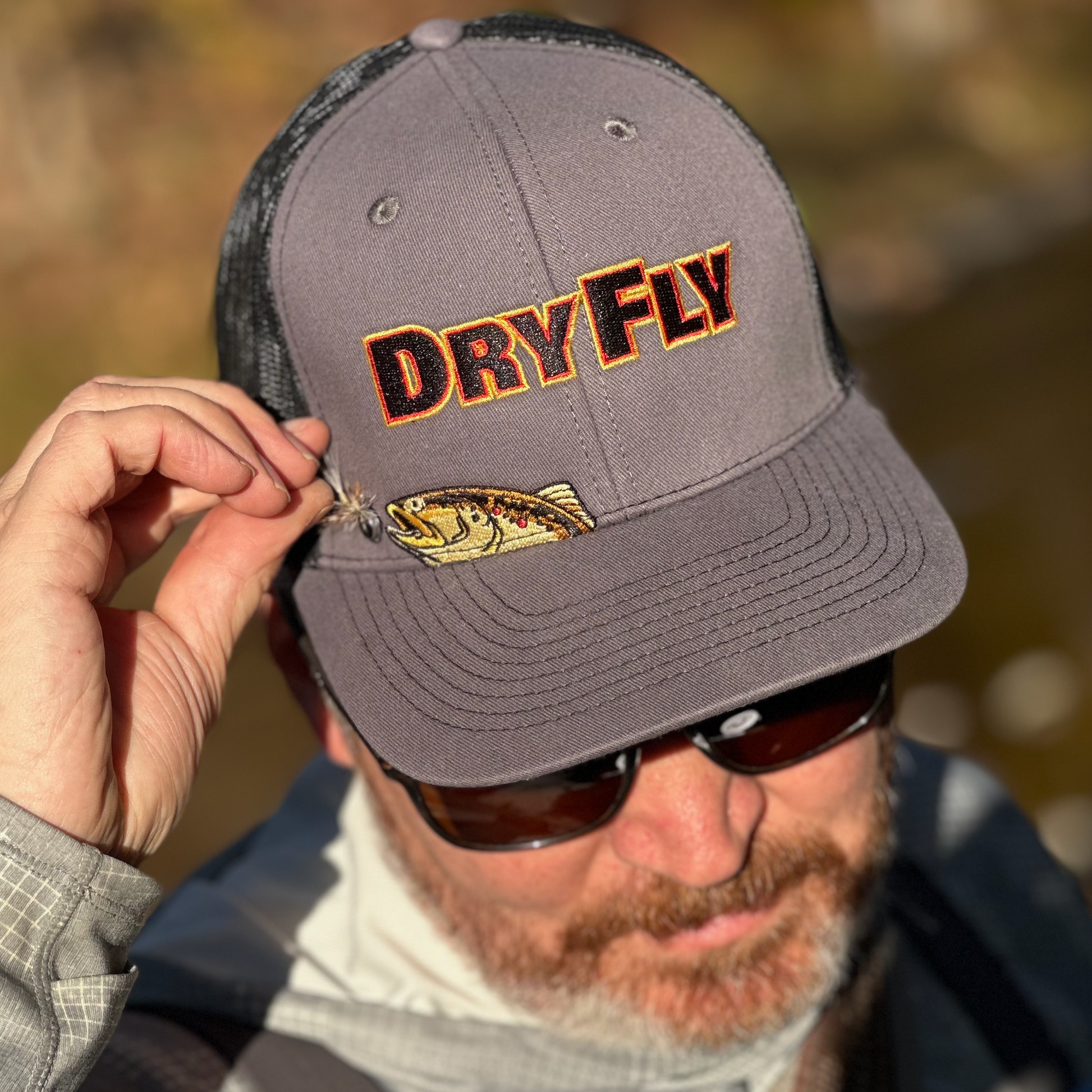 The Dry Fly Magnet Hat is everything you will want in a fly fishing hat… plus it has a built in magnet that will hold a few of your favorite flies while you are on the water. It has a classic trucker hat shape and design with a breathable mesh back and adjustable snap closure. A slightly curved brim and a medium height crown. The hat’s structure is definitely a step up from the old “Dad hat” but not too steep. The bottom of the brim is black to reduce glare reflecting up off the water. The sweat band is also black to avoid discoloration and ever looking dirty. The branding on the crown is big and bold - clearing answering the question of your fly preference. Dry Fly branding on the inside tape and on a small tag on the back left.